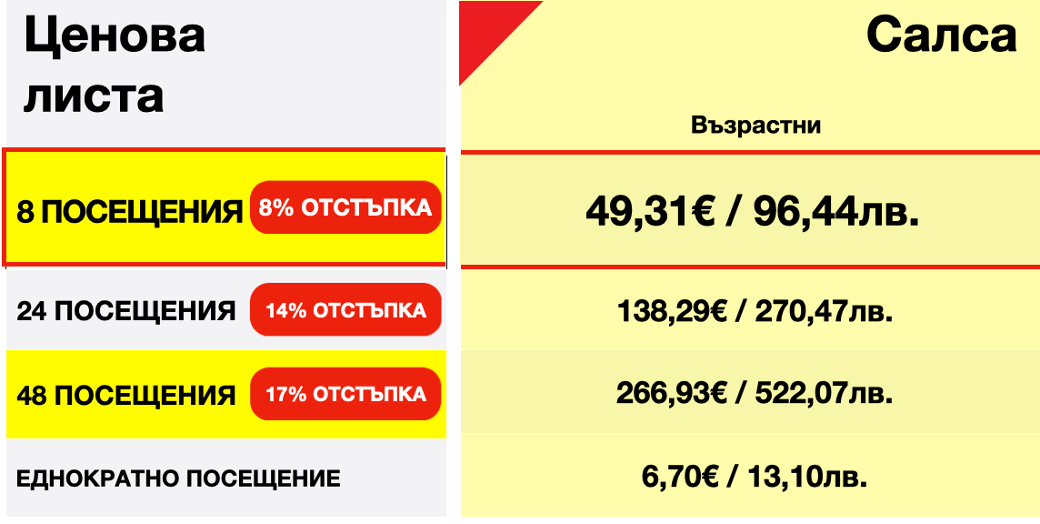 - Стилове: Има няколко различни стила на салса, включително Кубинска салса, Ню Йорк стил (салса „на 2“), Лос Анджелис стил (салса „на 1“) и други. Всеки стил има своите уникални характеристики и акценти в движенията.